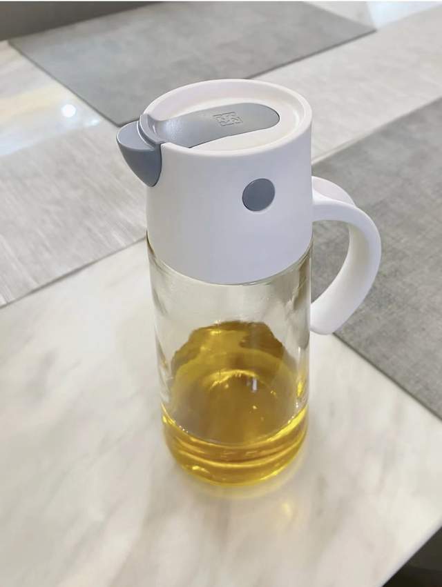 我这才仔细地看了看,瓶身是玻璃的,出油口是重力感应的,惟一瓶子歪斜,口自动掀开,倒油的时候,出油嘴不挂油也不漏油。